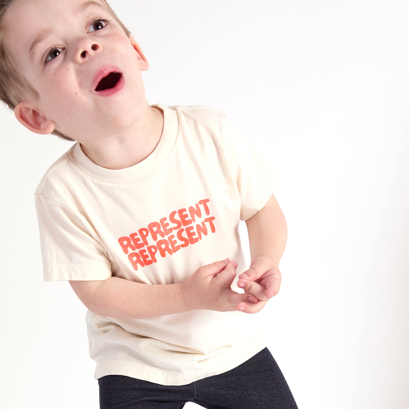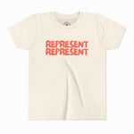 Let your kid shine in this bold Chatter Pop tee featuring "REPRESENT, REPRESENT" stacked in a playful bright coral type on a natural backdrop. Designed for comfort and self-expression, this shirt is ready for every playground adventure.