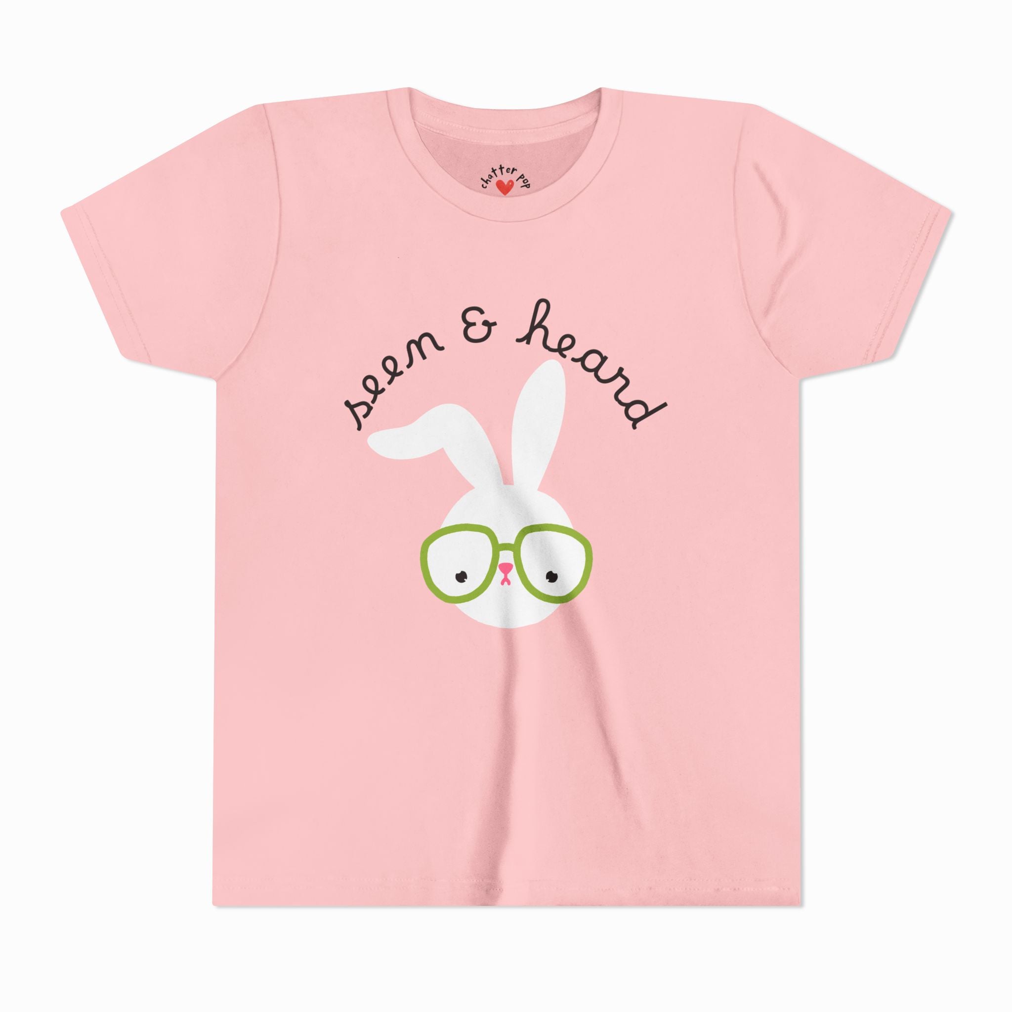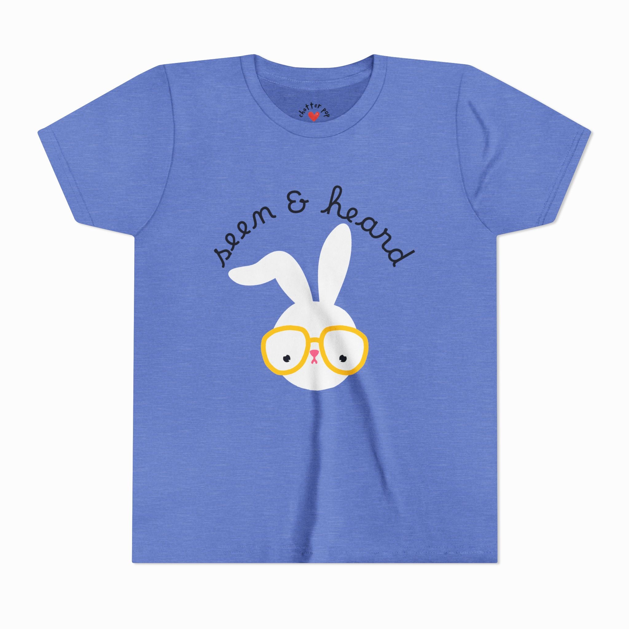 Let them shine in the Seen & Heard Bunny T-Shirt, made for kids with big ideas and curious hearts. This playful tee features an original bunny graphic with the empowering tagline "seen & heard," reminding every child that their voice matters. Crafted from soft, breathable cotton, it’s perfect for adventures at the park, creative play at home, or making new friends at school. Designed with comfort and style in mind, this shirt celebrates self-expression and the joy of asking questions.