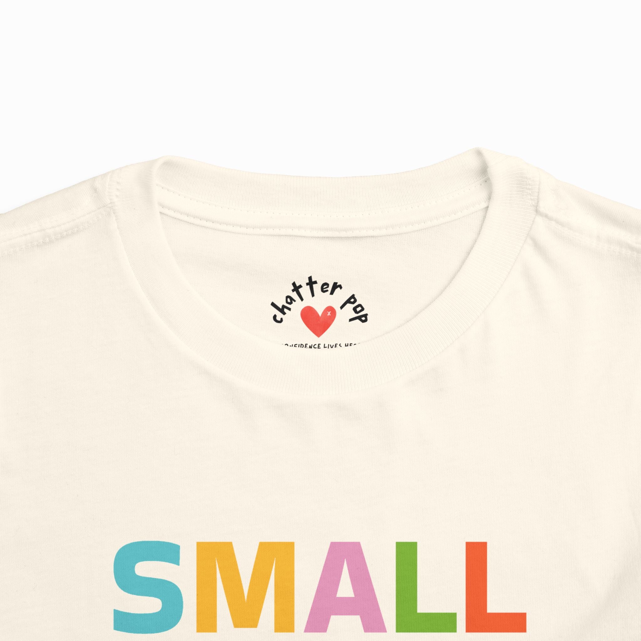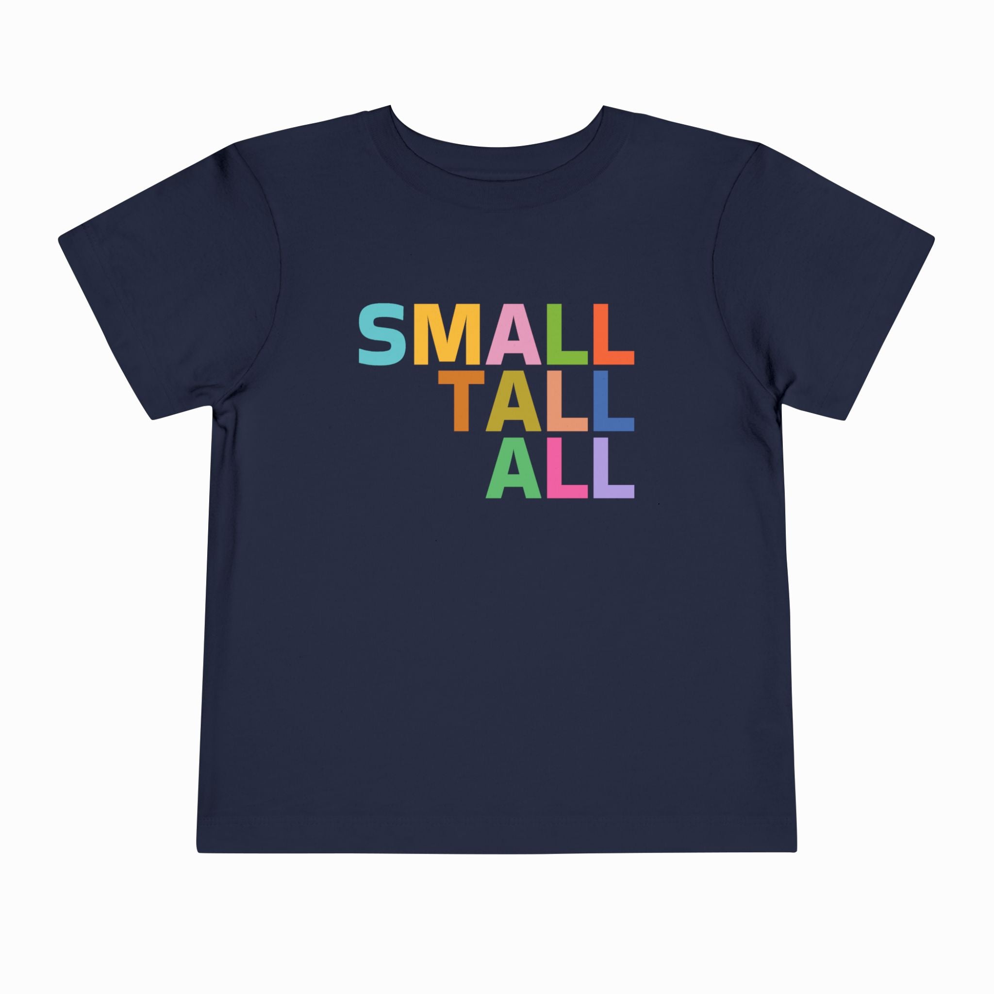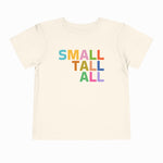 Celebrate every inch of awesome with our "Small Tall All" T-shirt, designed for little ones ready to explore, discover, and show the world who they are. Featuring a bright rainbow design with the words "Small Tall All," this T-shirt is a playful reminder that from mini to mighty, every size rocks. Choose from natural or navy to suit your style while giving your toddler all-day comfort and freedom to move, play, and express themselves.