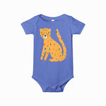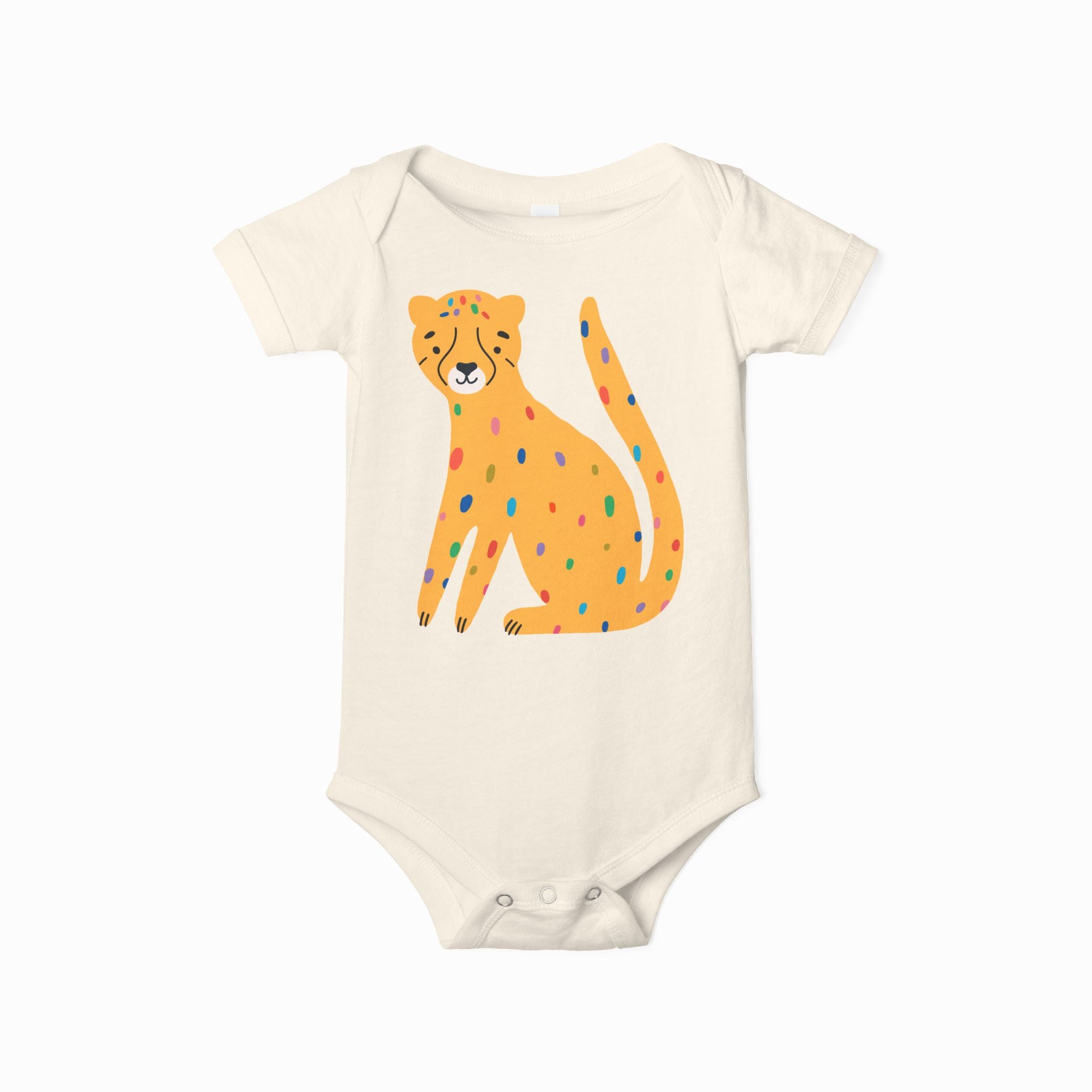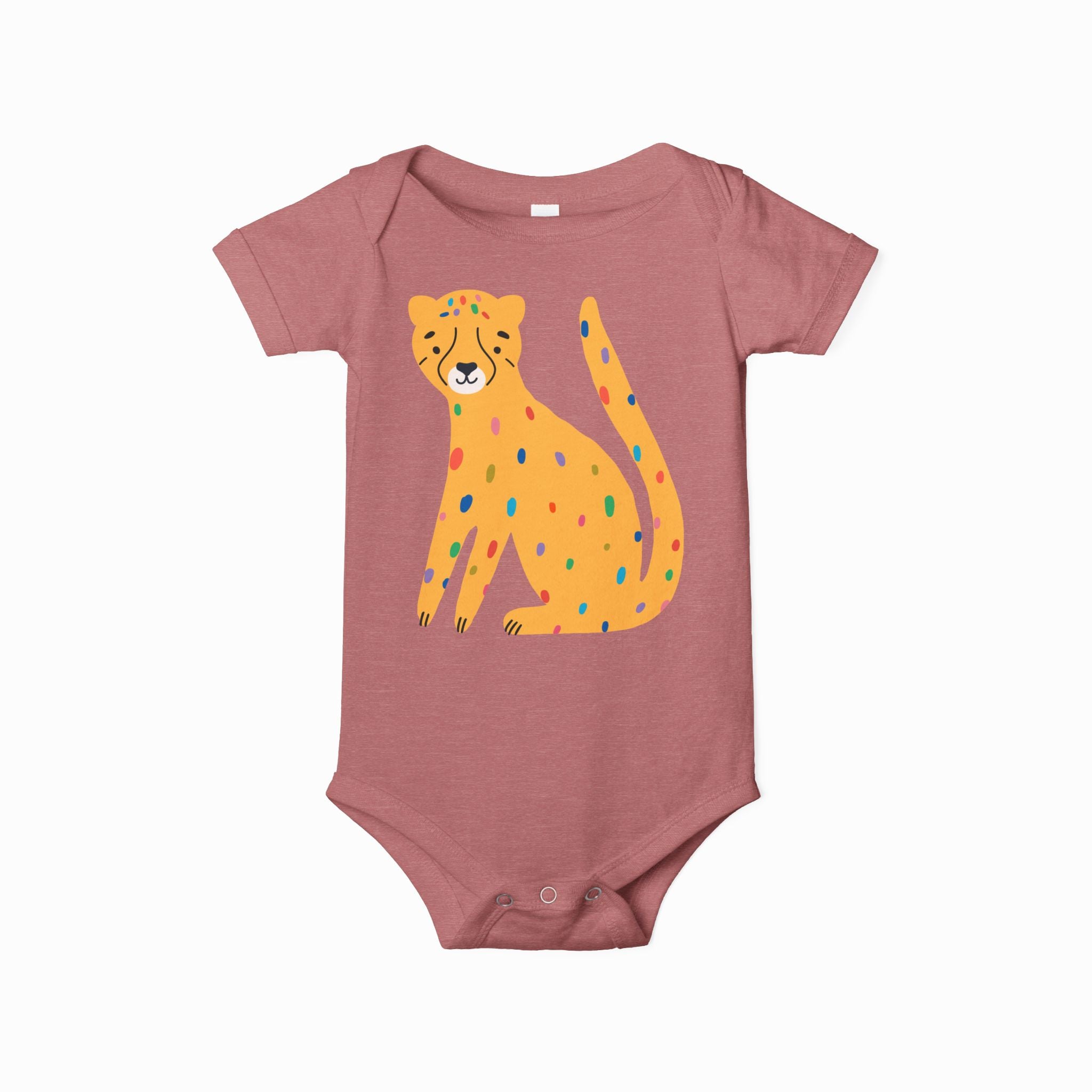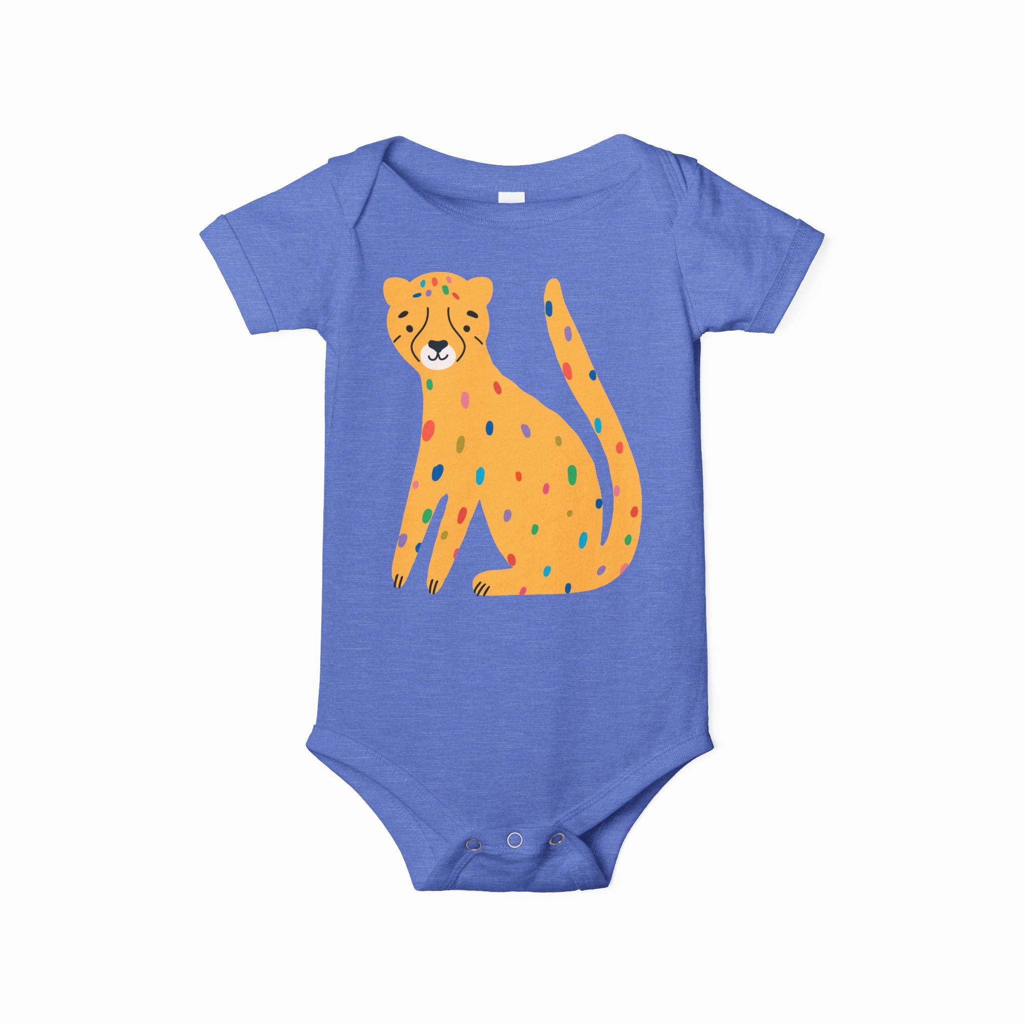 Let your little one explore the world in bold, joyful style with our Colorful Cheetah Bodysuit. This playful design features a smiling cheetah covered in rainbow spots that inspire self-expression from the very start. Available in heather Columbia blue, heather mauve, and natural, this bodysuit combines comfort, quality, and personality for everyday wear.