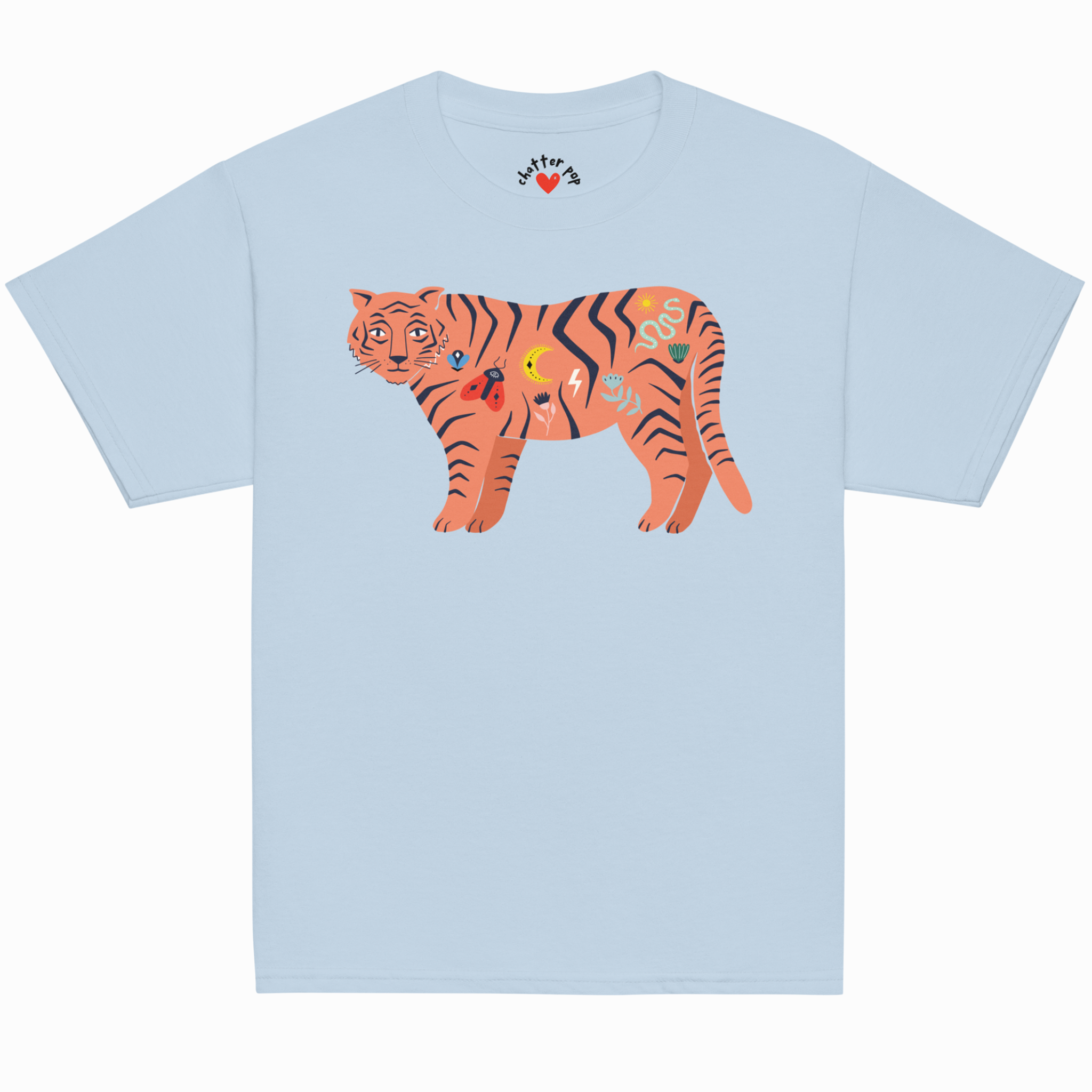 - Statement tiger graphic with fun, storybook symbols